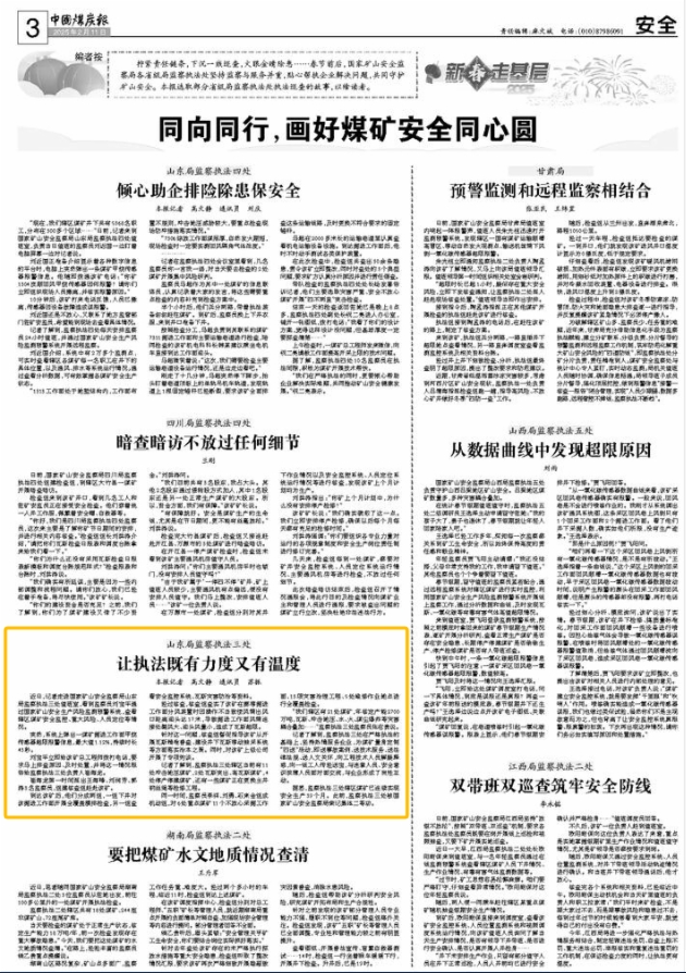 记者了解到,监察执法三处在严格执法的基础上,坚持热情服务企业,为煤矿量身定制“四送”活动,即送事故案例、送技术服务、送法律法规、送人文关怀,向工程技术人员解疑释惑,向一线工人传经送宝,与违章人员、安全意识淡薄人员面对面交流,与企业形成了良性互动。
